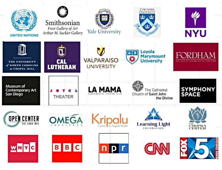 Kripalu Center for Yoga, MA, over 25 performances New York Open Center, NYC, over 20 performances Omega Institute, Rhinebeck, NY, over 10 performances United Nations, NYC, 4 performances Freer Gallery Auditorium, Smithsonian Institution, Washington, DC Memorial Hall, NC Valparaiso University, IN St. Lawrence University, NY Museum of Contemporary Arts, San Diego, CA Chopra Center for Well Being, La Jolla, CA Omega Institute's Conference in New York City St. Peter's Church, New York City Deepak Chopra's Millennium Event, Palm Springs, CA Second Annual Rumi Festival in Chapel Hill, NC Wainwright House, Rye, New York Appalachian State University, Boone, North Carolina CAMI Hall, New York City Cathedral of St. John the Divine, New York City Symphony Space, New York City Exoterica Poetry Society, Riverdale, New York, 10 performances Sufi Books, New York City, over 15 performances Poetry Project, St. Marks Church, New York City, 2 performances LaMama Theater, New York City The Joyce Theater, New York City The Abode of the Message, New Lebanon, New York, 12 performances New York University, New York City Columbia University, New York City Yale University, New Haven, Connecticut